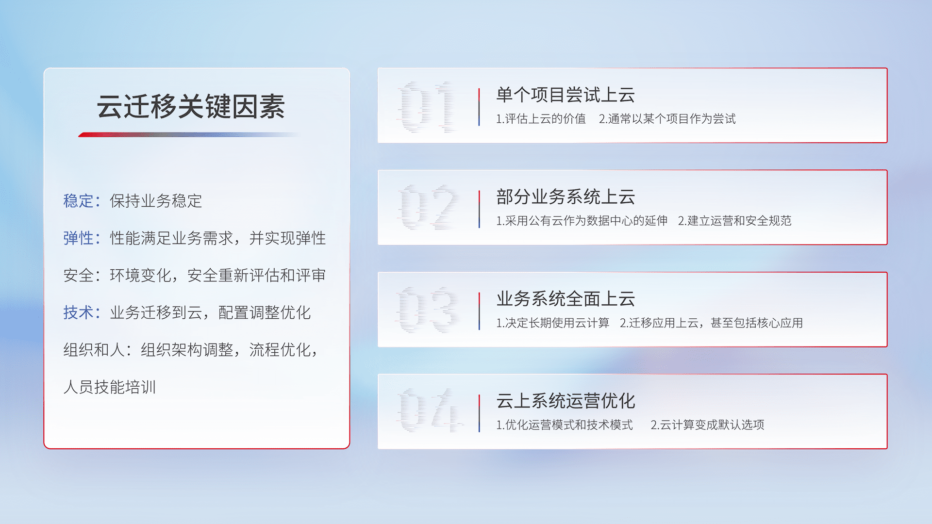 结合实际业务,,从规划设计、、、云平台选型、、、云原生改造、、、数据迁移、、、集成交付,,,,迁移全过程为客户识别最佳上云路径,,做好风险识别管理,,,设计网络架构、、身份权限、、、安全审计合规、、操作审计、、、日志审计、、、监控告警策略、、、多站点容灾设计等,,,对云上基础设施进行整体规划,,,,提升IT治理水平,,,以满足弹性、、、高可用、、、、高性能的需求。。。。