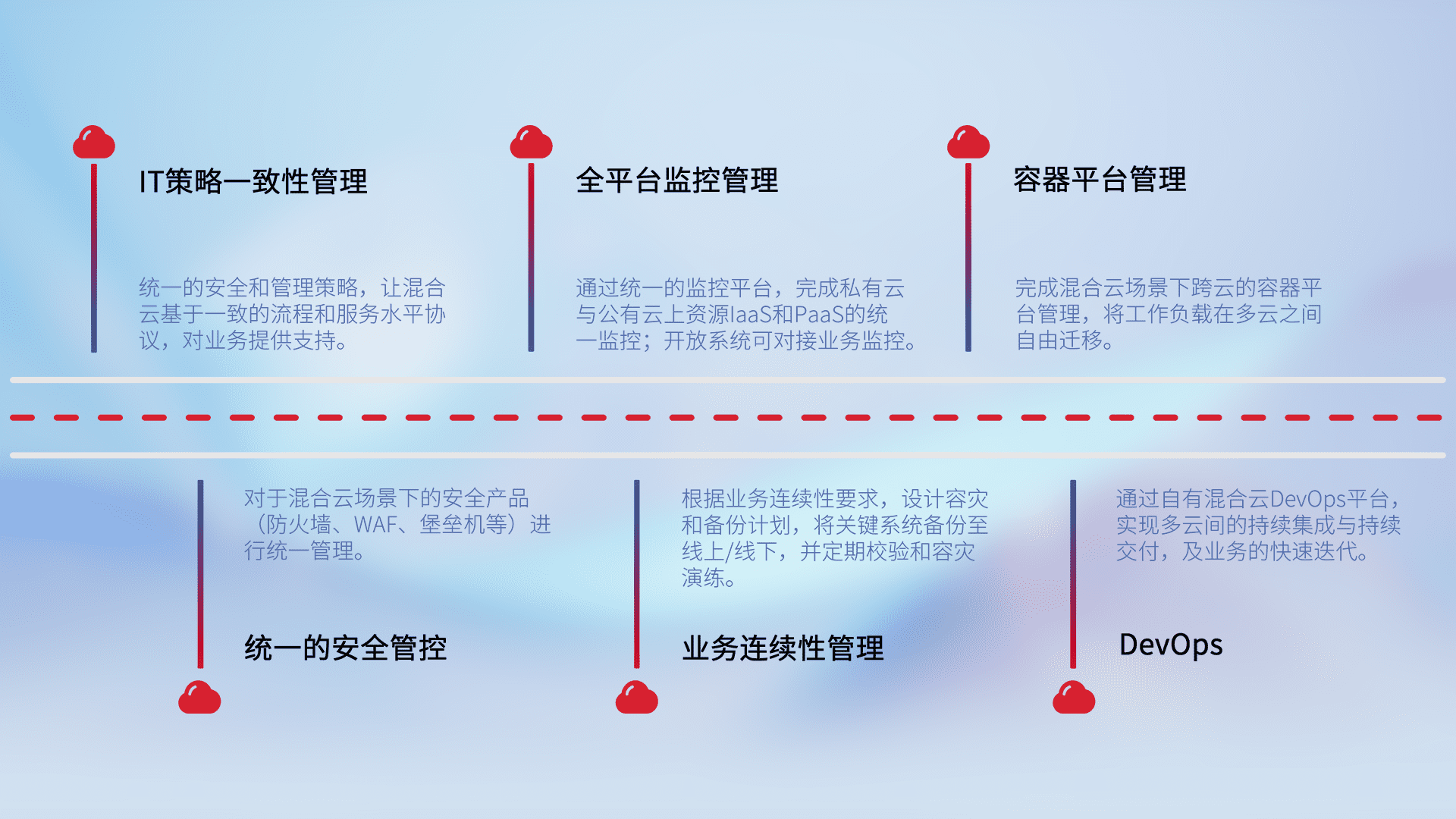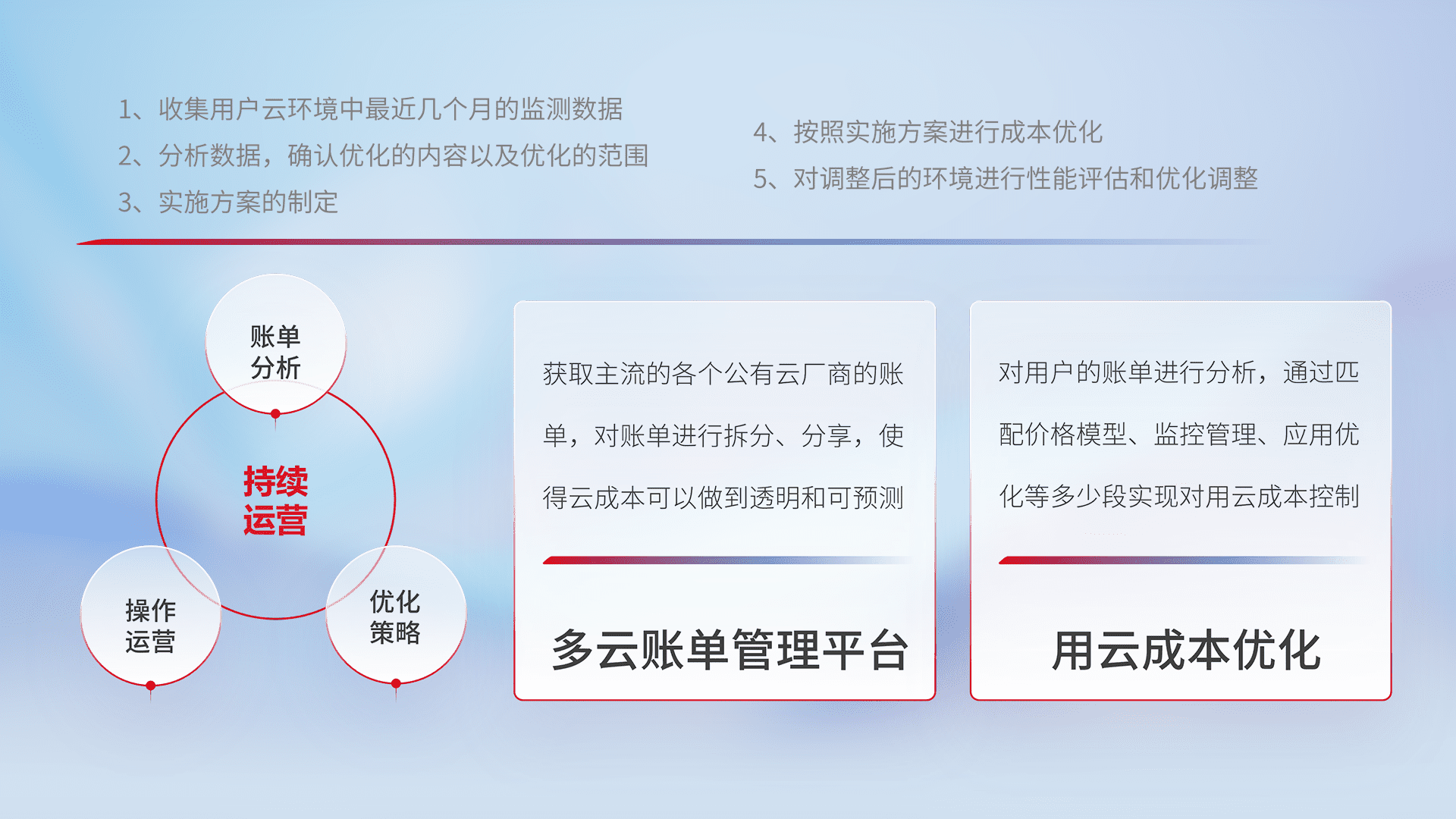 通过多云纳管,,,以统一的资源数据模型把客户的云资源进行抽象和封装,,进而实现对多云资源的统一操作,,,,保障云资源管理的可靠性、、、、稳定性与可用性。。。。量身定制化运维内容,,,,配置、、开发运维、、、、补丁管理、、、备份、、、监控、、认证和访问管理、、审计和日常巡检等,,,,保障在用云过程中的可靠度,,,稳定度以及高可用率。。。